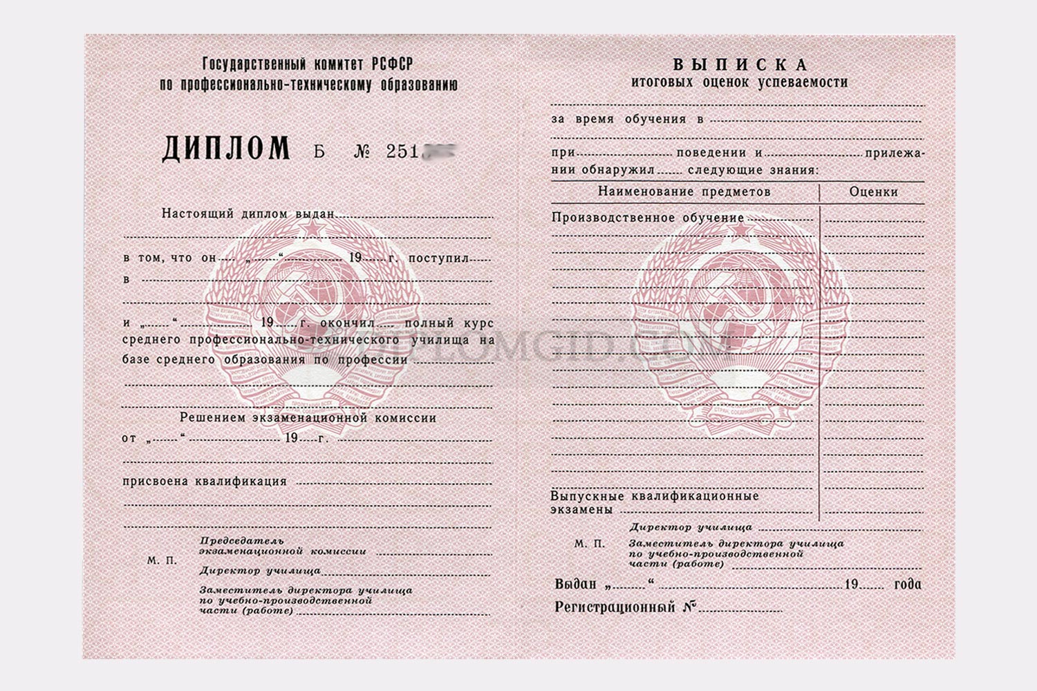 На нашем сайте Вы можете купить диплом ПТУ или ПТУ (училища или лицея) о начальном профессиональном образовании без обучения всего за 1 день. Продаём готовые корочки государственного образца ГОЗНАК, заполненные по всем стандартам и заверенные «мокрой» печатью и подписями ответственных лиц выбранного учебного заведения. Поможем быстро получить настоящий диплом для работы, карьеры или поступления в колледж или вуз. Обращайтесь!